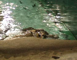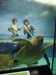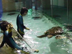 威嚇をしていたあいつにも ゆうゆうと近寄れるようになりました。 そのようすを動画でごらんください。 (↑こちらをクリックしていただくと、動画をごらんいただけます。) 水槽の向こう側は、けっこうな人だかり。 でも、誰も「取材」で掃除しているとは 思ってないです。 誰もミュージシャンが掃除しているとは 思ってないです。 誰もオリジナル・ラヴが掃除しているとは 思ってないです。 それは番長が必要以上に 一心不乱に床に腰を入れて ブラシをかけているからです。 さあ、これでカメとお別れですよ。