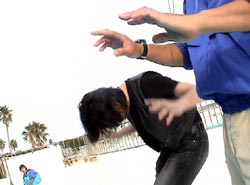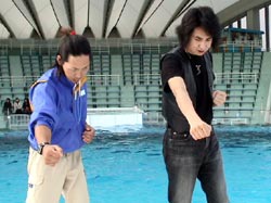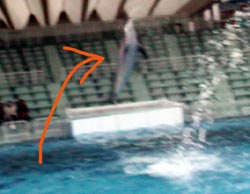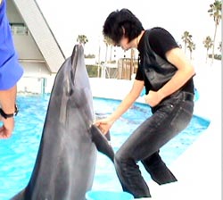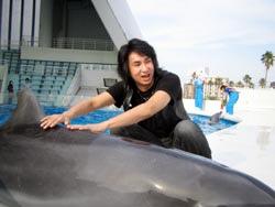 あ! 「握手」が決まりました、 決まりました。 番長、ものすごくうれしそうです。 次は、番長の指揮に合わせて2匹が ピー、ピキュー、ピー、キュー、と 鳴きます。 ひゃあ、かわいいですね! ここはマリンワールドですよ、 クリスマスのNHKホールではありませんよ、 というくらい、ダイナミックな指揮です。 自信がある分野では、番長はつねに やりすぎる傾向にあるようです。