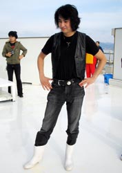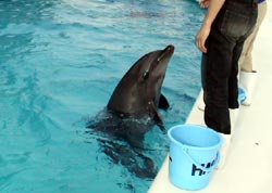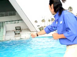 ■ニュース その2■ 海の生きものにフォーリン・ラヴ。 第8回 ライチ、行け! いよいよ本日のメインイベント、 イルカの調教です。 田島番長、ブーツを脱ぎ捨て、 純白の長靴に履き替えます。
