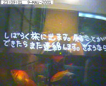 | <お別れメール> ちぇっす。 今日の夜は下北沢で開かれるROCKミーティングに 出席するROCK西本です。 夜は長いぜ! よく頂く質問の中の一つに 「夜になると金魚が見れないです。 何かトラブルが発生したのですか?」 というものがあります。 深夜や土日に多い質問です。 金魚アキンド兄弟社に企画が変更してからは、 「とうとう、打ち切りになったのですか?!」 というメールまで頂くことがあります。 お答えしましょう。 「何もトラブルは発生しておりません。」 でもどうして、夜は見ることができないのか? 答えは簡単、深夜は鼠穴自体に人がいなくなるからです。 節電を標榜する親会社の「ほぼ日」スタッフは 一番最後に退社する人が鼠穴中の全ての電気を消してから 退社することになっております。 金魚は節電対象である鼠穴3階に住んでいるので スタッフがいなくなると、電気が消されてしまいます。 奥に見えるのが金魚水槽だ。 たまに朝まで電気がついていることがありますが、 大体、そういう日はROCK西本もしくはハリさんが 徹夜をしていることが多いです。 深夜になっても金魚が見れているということは その時間も鼠穴は動いていると思ってもらって 間違いないでしょう。 さて本日の広告は江戸川区の「みつ」さんからの広告。 みつさんは旅立ちを考えているんだけど まだ迷っているんだとか。 そんな、みつさんから知りあいに向けてのお別れ広告です。 ハッピー系が続いてましたから、 ちょっと寂し目系の広告を掲載することにしました。 さて、金魚アキンド兄弟社では、あなたの三行広告を 募集しております。 下の書いてあるルールをよく読んで、[email protected] までメールで御応募ください。 今ならかなり掲載確率が高いです。 それではまた明日!