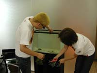 | <水育て始まる> こんにちは。 ROCK西本です。 世界陸上の見過ぎで寝不足です。 一番気になっているのは 「世界最小ハードラー」です。 さて、今週からは水育てが始まりました。 現在の水槽の水と同様の環境を 大型水槽にも作るってことです。 この日のために バケツに水をくんでおき、 カルキを抜くためにも一晩用意していたぼくでしたが、 水を入れてみると、あまりにも水槽が大きかったために バケツ1パイでは全く足りない。 darling号令の元、 水汲みが始まったのでした。 水を水槽いっぱいに入れてみると 新事務所の水は汚れていることが判明! どうやらろ過にも時間がかかりそうです。 ![]() 水が汚れていて曇っているでしょ。 大型水槽のために新しい砂利も買ってきました。 早速、水槽にいれようとすると、 「にしもっちゃん、まず砂利を洗わなきゃ!」 とdarlingからすかさず突っ込みがはいりました。 砂利がこすれて出来た粉や汚れをまずは洗うってこと。 「米を研ぐような要領でね」 と注意をうけつつ、砂利を洗いました。 砂利を洗って、水槽に移すと 小さい水槽からも砂利を取り出して 大きい水槽に移します。 小さい水槽に住んでいたバクテリアを 砂利を移すことによって 大きい水槽で繁殖させることが目的です。 ここでメールをご紹介。 ___________________________ 仕事の合間の気分転換に、 「今日も金魚は」を開いてみました。 すると新しくなったという水槽に、ずぼっと人間の手が 入っているではあ〜りませんか!時は15:56。 こっこれは一体!?と驚きのまま、 しばらくぼーっと見ていました。 その間およそ2分。 そしてふと、隣の席にいる ほぼ日読者仲間に報告したところ、 彼女が見た時点ではもう更新されていたようで、 いつも通りの金魚だけの世界に戻っていました、、、。 わずか数分の違いで、私だけが見てしまった秘密の世界、 得したような?不思議な気分になりました。 と同時にリアルタイムなんだなぁ〜という 当たり前の事を強く感じました。 ところで、一体どなたの手だったのでしょうか? そして何をされていたのでしょうか? keko ___________________________ ええ、そうです。 この手は「ぼく」の手です。 偶然にも砂利の移動中に金魚ページを見ていた人が いたんですねえ。 新旧の砂利をブレンドして 水草をいれることにしました。 ![]() 水草だけだと寂しい 土日でどれだけ水がきれいになるのかな。 大きい水槽からの中継開始は まだちょっと時間がかかりそうです。 |
