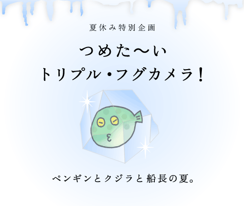 ほぼ日刊イトイ新聞における謎の伝統。 それは、社が長期の休みに入るとき、 日頃フグを淡々ととらえているカメラが どういうわけか3つに増え、 それぞれが無闇にパワーアップすること。 今年も夏休みに入るということで、 いつものようにがんばってみました。 山口、西田、そしてゲンくんの3人からなる 「山口工務店」がいつものごとく暴走。 今回は、氷の世界に、ペンギン? クジラ? クジラを追い求めている船長も出るって? 例によってなんだかよくわかりませんが、 もしも、時間を持て余しているなら、 3台のカメラを切り替えてお楽しみください。 それぞれのカメラについては、 いちおう、下で簡単に解説しておきました。 |