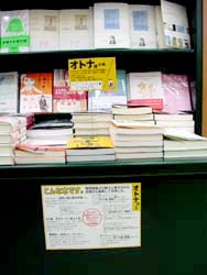 ※都内の書店に「ほぼ日」乗組員が 『オトナ語』POPを配達しに行きます。 ●三省堂 自遊時間 ●三省堂 神田本店 ●ブックファースト神田駅前店 いってきました神田ダヨ!!! 神田と言っても今日、 神田正輝さんは何ら関係ございません。 『赤いスイートピー』は『オトナ語の謎。』に 少しだけ関係していますが、 むろん、松田聖子さんとも関係はありません。 今日は三省堂本店へ向かうのでございます。 そう、『オトナ語の謎。』の新しいPOPを届けるために。 わたしはPOPと幸せを届けるウーマンさっ。 さあ着いた着いた、ここが三省堂本店だね。 「自遊時間 三省堂書店」 ん? 何か変わったのかしら? きれいになってるし、CDまで売ってるし! まいっか、おおあったあった『オトナ語の謎。』。 黄色とオレンジのはざまの あのハデ色表紙がうぅっ、まぶいぜベイベー!!! 4段上には、『智慧の実』本もあります。 ![]() ↑見事に端と端!!! 「おはようございます。 あやしいものではありません!」 ご挨拶を済ませ、 それでは作業に取りかからせていただきます。 ちゃちゃちゃっとな。 じゃじゃじゃーーん。 小さいPOPはビヨンビヨンにはさみ本の近くへ。 大きい方は本の下に貼る。というのが、 あたしの実験結果の中で 一番キレイなパターンかなあと思います。 ![]() ↑これがビューティフォーな感じの貼り方。 きらりん。 ありがとうございました! しかも追加の注文もいただきましたー。 サンキュウ、自遊時間さん!! これからも自遊な時間の提供よろしくたのむぜっ! さてさて次は‥‥ 自遊時間を出た途端に目に入ったのは‥‥? 「三省堂 神田本店」 ああへえそうなんだー。 やっぱさっきのはさっきので、 神田本店はまた別ものだったのね。 どうりでショップ自体が1フロアしかないわけだわ。 おおいたいた。 『オトナ謎の語。』さん。 新刊として2ヵ所、 そして売り上げ順位の棚にもありました。 順位は‥‥9位!!! おお〜テンに入ってるんだね。ナイスナイスがんば!! 「おはようございます。 わたくしあやしいもののように見えますが、 そうじゃございますん。かくかくしかじか‥‥」 では作業させていただきまーっす! たくさん『オトナ語の謎。』が積んである所に 前のPOPがありますねえ。 そうそう、これを、これにリニューアルするのよ。 おっとーーー? なんと今まさに『オトナ語』POPの チェンジ準備をしている私の目の前で、 『オトナ語の謎。』を立ち読みしているリーマンさん発見! 読んでる読んでる。 笑って‥‥る? ない? チェックは角度が合わずうまく出来ず。 ちょっと観察続けてると‥‥あらら行っちゃった。 わたし、まだ諦めません。 彼が次に何の本を立ち読みするか。 これはとっても重要な事だと思われ、観察してると?? なんとすぐ後ろの島にあった、 『トリビアの泉』本を手にお取りになられました〜! なるほどね。うんうん。わかるよ。 そんなこんなで、はい。設置完了〜。 ありがとうございましたーん。 ![]() ↑ドドドーーーーーーーーン! ド・迫・力!! さてさて続きましてブックファースト神田駅前店。 「おはようございます! かくかくしかじか丸書いてちょんっ」 「えーっと今日、担当の者が休みなので、 今日はお預かりしておいて、 後でこちらで設置させていただく という形になってしまうのですが、 それでもよろしいですか??」 「あーそうですかー。 よければ私が今やってっちゃいますけど‥‥」 「いやー担当の者が休みなので、 どうしたらいいのかがわかりかねますので」 しゅん。残念。 「では、どうぞよろしくおねがいいたします!」 「オトナ語の謎。」は、今日も色んな本屋さんから、 色んなお家に持ち帰られていくのであった‥‥ がんばれオト謎くん!!! (ゆーないと) ●文教堂 経堂店 先週金曜日にPOPをお届けしたとき、 『オトナ語の謎。』は堂々、 店内入り口近くの目立つ場所で平積みに! ありがとうございます! 店員さんにお礼を言うと、 「知り合いのところで完売したって言うんで、 期待してますよー。」 とのこと。はい、期待してください! そして再度日曜に訪れると、 今度は、「話題の本」のスペースに、 『オトナ語の謎。』がこっちを向いてにっこり!! ありがとうございます!! その周りには、ほんとうに今話題のベストセラーがずらり。 さらに隣りの棚は丸々「新撰組」コーナー。 必ずお客さんが目を通す空間です。 経堂店さん、感謝です! (りか) ![]() ※こちらは、オトナ語バナーを貼ってくださった方の ホームページをぽつぽつ紹介していくコーナーです。
