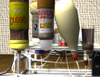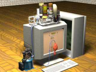 随分と、場所をとるんやね。 まあ、ちーとばかし。この金魚型インターフェースを噛みしめたまえ。 なんやブツブツ小さな穴があいてまんねんね。 それがポイントや。…よし。ファイル開くで。クリック! ガシュ。ジュワワワワ、チュチュチュルル、ヌ〜。 あっ…。 どうした。わかったんか。 お袋…。 ふふふ、わざわざ君の実家に行ってまで でも、どういう仕組みで…。 まぁ、見ての通りや。 ええ、砂糖・塩・酢・味噌・醤油…やったっけ。 そや。ほんで、この機械はそんだけでなく ようは…今の実験みたいに味を各種調味料に分解して…。 もっかい調味料を混ぜこぜて味の情報をそのまま転送。 ほんなら、ケーキ屋のホームページを開けばいつでも甘さが… そうや。 単身赴任のお父はんもモニタの前で金魚をくわえれば そうや! でも…。このスポンジやで。 もち、わかっとるがな。 噛んだらやばくないやろか?それって…。