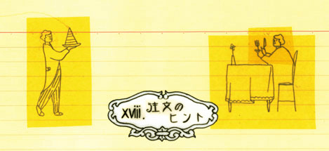![]() 隣のテーブルに目移りする。 あんまりジロジロ隣を覗き込むのは当然、 立派なマナー違反だと思います でも何を頼もうかあれこれ悩み決めあぐねている時に、 なんだかおいしそうな料理が隣に運ばれて来たら? そんな時、近くのウエイターにそっと目配せして 「あちらのテーブルのご婦人が頼まれた料理、 とてもおいしそうですね」 と聞いてみるぐらいはいいんじゃないかな? 指さして「あれは何?」って大声で聞く、とか、 逆にみんなでチラチラ見ながら ヒソヒソあれはなんだろうと噂する、 ようなことをしさえしなければ、 他の人が頼んでいる料理は この上もなく説得力のある参考資料なのだから 利用しない手はないですよネ。