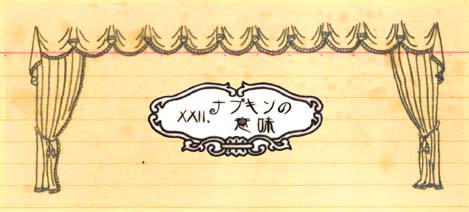 劇場に入るでしょう? ロビーや劇場のしつらえを悠々と眺めながら、 プログラムに目を通しながら、 今日はどんなパフォーマンスを 楽しむことが出来るんだろう、と思っていると、 幕の後ろからオーケストラの チューニングの音が聞こえたり、 大道具の最後の調整をする音がしてきたりと、 いろんな気配を感じながらドキドキしますよネ。 緞帳があがると同時に、 それまでの期待が一挙に現実となって ボク達を襲う‥‥というのが、 ビデオや映画なんかでは味わうことの出来ない、 ライブパフォーマンスの醍醐味です。 レストランでお食事、というのも まるで同じくライブパフォーマンスの一種だ、 とボクは思ってるんです。 店の設(しつら)え、メニューを眺めること、 厨房から料理を作る気配を感じること。 劇場における「待ち」の状況と 驚くほど似ているでしょう? 劇場にあってレストランに無いもの、 それが「幕」であって、 レストランにおける劇場の幕=ナプキンだ、 とボクは考えているんです。 贅沢だとは思いませんか? 劇場の幕は観客に有無を言わせず一斉に上がります。 でもレストランでは、お客様が自分の意思で幕を上げ、 下ろすことが出来るのです。 まあそれだけに演ずる方の苦労は 大変なものなんですけれどネ‥‥。 私はもう料理を楽しむ準備が出来ました、 という合図にナプキンを取る。 大抵が注文をし終えた後、 ということになるでしょう。 お店によっては、一番最初に アミューズと呼ばれるお通しのような小さな料理が 出ることがあるけれど、 そんな時以外は、注文をし終えたときで大丈夫。 ああ、一仕事終えました、 あとは美味しい料理に身を任せるだけ、 というような安堵感と一緒にナプキンをひろげる。 これが一番スマートでしょう。