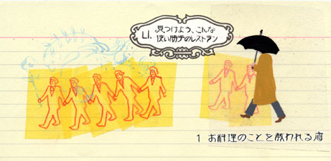 ![]() あなたの手帳には、 どんなお店がリストアップされているでしょう? 好き嫌い。当然、反映されているはずです。 和食が好きな人、フランス料理が好きな人。 新しい店が好きな人、老舗が好きな人。 人それぞれに、 それぞれのラインアップが用意されている。 ボクの知り合いに、 「一人で食事するのが大好き」な人がいて、 一度、彼のアドレス帳を見せてもらったのですが、 それが面白かった。 ほとんどすべての店が「カウンターがある店」でした。 そうでなければ、サービス上手で おしゃべり好きの店長やソムリエがいる店。 一人で食べる、といえばファストフードや ファミリーレストランが便利だろう、 と思っていたのですけれど、彼に言わせると、 そうした店で一人で食事していると、 本当に一人ぼっちで飯を食っているような 絶望的な気持ちになるのだそうです。 だけど、オープンキッチンのカウンターで シェフの仕事を眺めながら食事すれば、 一人でも何時間だって楽しく時間を過ごすことが出来る。 あるいは、素敵なサービススタッフのいる店ならば、 会話が楽しいし、 たとえ忙しくて話をすることが出来なくたって、 そうした人の働く姿を眺めるだけで、 1時間は驚くように早く、楽しく過ぎて行く。 だから気づけば、そうした店ばかりが リストの中に増えてゆくんだよネ。 確かにその通りに違いないですネ。 このように人それぞれに、 それぞれのアドレス帳になりはする。 ‥‥するのですけれど、 でもいろんな使い勝手の店を最小限、 ラインアップに加えておくことは 素敵な社会生活をするのに重要な工夫じゃないか、 と思います。 そこで、ボクなりのアドバイス。 見つけよう、こんな使い勝手の素敵なレストラン。