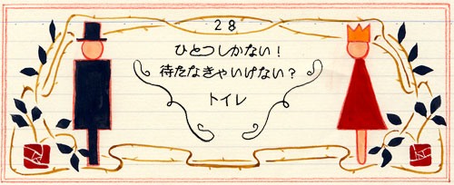 トイレが一つしかない店で、 混み合ったトイレを待つのに スマートな方法ってないんでしょうか? 小さくて親密な空気が流れるレストラン。 サービスが行き届き、 厨房の中で出来上がったばかりの料理が 出来上がったばかりの状態で提供される、 とてもシアワセなレストラン。 なのですけれど、そうした店の数少ない弱点の一つが 「お店の中にトイレが一つしかない」 ということであろう、と思います。 トイレに行かずに我慢できるだけの 強靭な肉体と精神を持ち合わせているのであれば それもたいした問題にはならないでしょうが、 特に女性にとってはこれは忌忌しき問題であろう、 と思います。 なぜなら女性にとってトイレというのは、 単に用を足す場所にあらず‥‥、だから。 トイレは別名、パウダールーム。 つまり化粧直しをして、 いつも美しくあるための場所でもある、ということです。 男のボクでもお好み焼き屋さんに行ったときには、 食後、トイレに駆け込んで歯に青海苔がくっついて とんでもない状態になっていはしないかどうか 確かめるくらいですから、トイレの役割は重要です。 ところが小さなレストランには往々にして トイレが一つしかない。 とはいえ、当たり前に考えれば 20席かそこらの小さな店ならば、 トイレが一つしかなくても支障はないのだけれど、 運命のいたずらというのか、 不運な偶然と呼べばいいのか、 その一つのトイレに何人ものお客様が ほとんど同時に殺到する、 というようなことが起こってしまう。 たまたま同じくらいの時間に 数組のお客様が食事をはじめ、 これまたほとんど同時に食事を終えると、 たちまちトイレが大混雑、というような事態が起こる。 困ったことです。