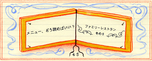でも、たいていはグランドメニュー以外にも メニューが用意されているものです。 その時間帯、その季節などに応じて お客様にお勧めしたい商品を載せたモノ。 ランチメニュー。 ディナーメニュー。 販売促進メニュー。 厨房のお勧めメニュー。 ‥‥などなど、いろんな呼び方で いろんなメニューが用意されています。 レストランの人たちはこれらのメニューをまとめて 「挟み込みメニュー」と呼んだりします。 グランドメニューのページとページの間に 挟みこまれて手渡されることが多いからですね。 この挟み込みメニュー‥‥、 グランドメニューより確実に薄くて小さい。 ほとんどの場合がペラペラの一枚メニューだったりして、 製作する費用も格段に安くて済みます。 だから簡単に交換できるし、頻繁に変更することもできる。 普通、グランドメニューというのは 短くても半年ほど、 たいていは1年間は使うようにできてます。 それに比べて挟み込みのメニューの試用期間は 1ヶ月から数ヶ月。 つまり、挟み込みのメニューは、 厨房内の新しい料理に対する対応力とか、 柔軟な姿勢などの指針になります。 やる気のない厨房は 挟み込みのメニューを嫌いますからネ。 厨房の作業は、適度に複雑で 適度に不慣れな調理を一つ一つ克服することで 上達するもので、だから優秀な厨房のスタッフは、 適切な挟み込みメニューを、 自分達の表現力をアップさせるための 良いキッカケとして歓迎するもの。 だからといって、あまりに多くの 種類の挟み込みメニューは逆効果。 厨房のスタッフが新しい料理の調理手順を 習熟しないうちに どんどん次の新商品がやってくるような状態。 厨房の中はてんやわんやの大騒ぎです。 それになによりこのファミリーレストランは、 何をお客様に売ればいいのか判断すらできない 優柔不断で自信のない経営者が経営しているんだろうな、 と思えばいい。 経営者が迷っているレストラン‥‥。 そこに素晴らしいサービスとか 素晴らしい料理とかを要求するのは無理がある、 と思って間違いないでしょう。 だからグランドメニューと一緒に あまりに多くの挟み込みメニューを手渡されたら。 そんなときは挟み込みメニューはそのまま テーブルの上に置いて、 グランドメニューだけに集中しましょう。 不慣れでおそらく完成度の低いであろう 商品の一覧表に違いない挟み込みメニューに 目を通すのは時間の無駄遣い。 だから、グランドメニューの中の一番、 簡単にできそうな料理を探す。 間違いないです。 あなたの手元に程よく分厚いグランドメニューと、 控え目なサイズの挟み込みメニューが一冊づつ。 メニューはそれだけ。 今日のあなたは幸運です。 グランドメニューと挟み込みメニューを かわりばんこに眺めながら、一生懸命悩みましょう。 多分、何をたのんでもこの店だったら大丈夫。 でもなかでも何をたのめば、とても楽しい食事になるのか? レッスン・ツーの始まりです。次回につづきます。 illustration = ポー・ワング |