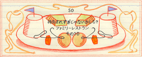 ![]() さあて、お料理が出来上がるまでの間、 おしゃべりで盛り上がるのもいいですけれど、 ちょっと回りの景色を見てみましょう。 どんなお客様が来てるでしょうか? いろいろな人がお客様としてやってくる ファミリーレストランの醍醐味の一つは、人間観察。 そういうと、ちょっと変な人のように 思われるかもしれませんけど、でも楽しい。 楽しい以上に、このお店はどういう店なんだろう、 というコトがわかる。 それから、この店でこれから どういうことが起こるだろう、 というコトもわかってとても勉強になるんです。