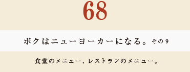 カフェや居酒屋のような店では自分が食べたいものを、 思うがままに注文すればそれで良い。 ボヘミアンな自由をたのしむお店であります、 料理が出てくる順番だって 「でき次第でいいですよ」 っていうのが粋というモノでしょう。 一方、食堂やレストランでは まずメインの料理をエイヤと決めます。 食堂ならばメインだけでもよし、 そのメインの料理を引き立てるような サイドをとればなおたのし。 レストランならメインがやってくるまでの時間を たのしくつぶせる料理を‥‥、という具合。 難しいのが食堂のようにも、 実はこのお店に通うようになって間もない頃に、 ボクはニューヨークという街に 10分ほどもしましたか。 そしてそのとき、 |