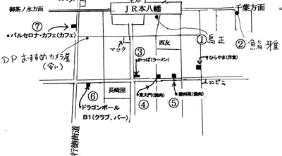 「CUP」もいい店ですね〜。 トーストとかね。 昔ながらで、活気もありますよ。 オススメに追加です! さて、というわけで南口です。 もともとは、ナ〜ンもなかった南口ですが、 今では居酒屋とパチンコ屋を中心に栄え、 北口をしのぐほどです。 パチンコ屋は、 おそらくプロからも注目され続けている老舗ばかり。 南口に3〜4軒ありますが、 どれも開店前には列ができます。さて、オススメ店です。 ![]() 1 鳥正(焼き鳥 047−378−4890) 飲食店も新しい店が多いですが、 鳥正(焼き鳥、047−378−4890)のように 数十年前からやってる店もあります。 ここは、本八幡であまりにも定番。 美味しいですよ〜〜。 僕は焼き鳥は、同小売店にて直接買いますので、 この店にはあまりいません。 2 鮨雅(寿司店 047-378-4890) 鳥正の先を、線路沿いにずうっと200メートル以上歩く。 カン高い声で、まるで気の違ったような オカしなノリを見せる板さんがいるのが鮨雅。 銀座寿司銀を、10年修行すれば、 暖簾わけしてもらえるのに、 わざわざ9年まで働いてやめてしまって、 暖簾わけされなかったという、変わった経歴。 ヘンな冗談ばっかりいってて、変わった板さん。 悪い感じはもちろんしないし、綺麗な店内です。 塩で食べさせる白身や、芽ネギなど、 工夫いっぱいの寿司が、 値段は下敷きメニューの明朗表示で安心。 けっこう安めに食べられます。 回転じゃない寿司をたまには! ちなみに僕はお刺身など食べずにいきなり、握りです。 3 かっぱ(ラーメン 047-370-3324) 新しい店の代表といえばこれ。 若きラーメン王の石神氏に誉められ、メディア露出 で、いわゆるニューウェイヴラーメンの急先鋒として、 本八幡でほぼただひとつの年中行列店にのしあがりました。 美味しそうな焼酎があったり、食欲をそそります。 塩ラーメンがおすすめかな。 4 東大門(焼肉 047-379-9930) 本八幡の魂のような、海の家のような昔風の焼肉屋。 ここのオススメは、昼間のランチの海鮮ビビンバ (メニューに出てないかも、口でいって頼んで下さい) これは珍しい! 揚げニンニクや、ドブロクなど、サイドメニューの豊かさ。 カニなど、珍しいものがたくさんあります。 夜遅くまでやってて、ホステスさんも来ますよ! ☆5 慶州苑(焼肉 047-376-9333)特典付! ![]() 最近、行くようになったクオリティ焼肉の王者! カルビ、ハラミなど、最高の肉! コムタン、ユッケジャンなどもウメエ! レバ刺し、馬肉刺しなど、刺しものも最高でんがな! トントロもオススメかな。 値段は、激安店ではない通常の焼肉屋といった感じだが、 肉が多目なのか、なぜか安めに済むのです。 奥にはいつも常連がいて、 スナックみたいな状態になってますが、 気にしないで下さい。 気さくな人たちですから。 ☆特典 ほぼにちサエキの連載を見たといえば、 ウーロンハイ、レモンハイか、 ソフトドリンクをプレゼント! 6 キッチンハウスひらやま(洋食 047-379-4889) 地元の人がだれも注目してない、超穴場の洋食屋がこれ。 とてつもなくガンコそうな親父がやっている。 危害は特に与えないので、安心して入ってください。 ハンバーグとかシチューとか 洋食っぽいメニューが中心なのだが、 飲むためにやってる飲み屋風の部分もあり、 日本酒が充実していて、 鳥刺しなど、美味し肉刺しが実はオススメ。 そして、ローストビーフなど、 連れてった食道楽をうならせました。 ランチはお得。 ☆7 ドラゴンボール(クラブ 047-376-9335) 特典付! ![]() ![]() HP: www.bardragonball.com e-mail: [email protected] 冒頭の年配のいとうさんも安心して飲めるクラブ。 あの「SNOOZER」も年一回やってるし、 地元民だった黒人ベーシスト、 ポール・ジャクソンも年に一回ライブをし、 地元ハウスイベント「SAKURA MOON」も月一回盛況な、 中箱の広さだが、平日はカフェっぽくしっとりやってます。 駅前にあった「ラグタイム」という店から続く、 本八幡シーンの中心! 市川のわからないことあったら 店長の平岡さんに聞いて下さい。 ☆特典 ほぼにち、サエキページを見たといえば、 なんと! ドリンクなんでもプレゼント! だと! ワインでも、ビールでも、なんでも! 太っ腹!! 8 バルセロナ・カフェ(カフェ) おまけ。 行徳街道沿いに最近できた、 本八幡にしては、まあまあ、イカすカフェ。 スペイン人がやってるそうなので応援しま〜す。 以上、食べて、飲んで楽しい本八幡、おいでませ〜! お便り待ってます!