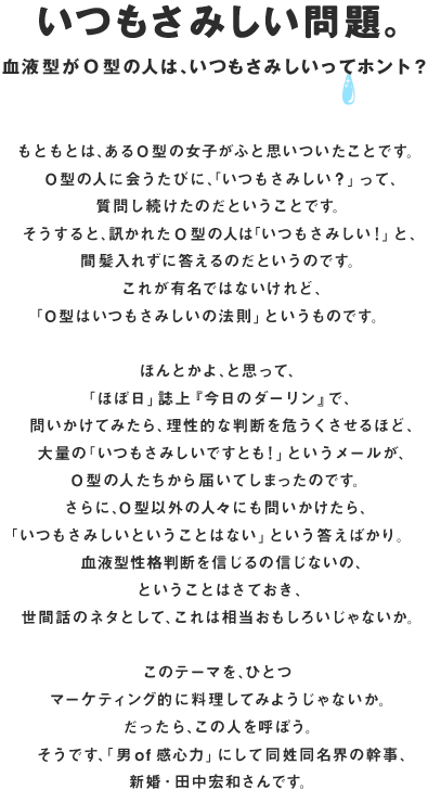 いやはや、ごぶさたしてました。 「いつもさみしい」人もそうでない人も、 O型の人もそうでない人も、 ホモサピエンスに分類される 善男善女のほぼ日ッチャーのみなさんがた! す、す、すまんでした!! 一身上の都合以上に、 更新を滞らせてました、 いや、実はトドを凍らせておりました、 「いつもさみしい問題」対策本部所属、 O型の田中宏和でございます。 あっという間に、 2004年も残りわずかになっておりまして、 え、もう一年を振り返るに旬な時期であります。 今年のテレビでは、 やれ「韓流」だ、やれ「ヨン様」だと、 取り上げられておりましたが、 もうひとつのブームは、 間違い無く「血」だったと思うわけです。 そうです、あのおびただしいほどの 「血液型番組」であります。 さすがに、最近になって、 「子供への悪影響」だとか、 「血液型差別」だとかと言われはじめ、 自粛ムードを感じるわけですが、 ここ「ほぼ日」における 今年の血液型モノといえば、 なんといっても 「血液型がO型の人は、 いつもさみしい問題」、 「O型の86.3%は、いつもさみしい。」 (「ほぼ日」調べ)につきるわけです。 たくさんメールをいただきましたー。 ほんと血眼になって読んだりもしましたが、 どうもありがとうございました。 今日はこの連載を振り返りつつ、 新たなメールもご紹介しつつの 中締めの回とさせていただきたいと思います。 まずは、この二行だけのメールからご紹介。