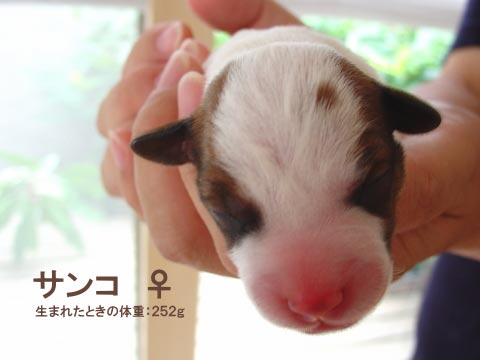 左右にブチがあり、おでこの左すみには小さな点あり。