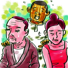 と父母の機嫌をとる高校球児。