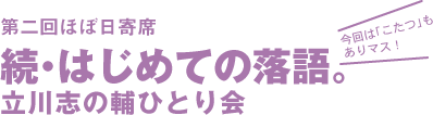 「続・はじめての落語」。 たくさんの方にお申し込みをいただいてます。 途中経過をみますと 昼の部と夜の部の倍率を比べると 若干、夜の部の倍率の方が低いようです。 どちらが絶対に当たるというわけではありませんが これから申し込む予定の方は ご参考にしていただけるといいかと思います。 先日、とある楽屋で志の輔さんと このイベントの打合せをしておりました。 今回のイベントの大きなポイントは 落語を生で楽しむだけでなく、 客席中央に設けられた 「ほりごたつ」での「こたつトーク」。 舞台とこたつをいったりきたりするという 今までやったことがない試みだけに この日、打合せの大部分が そこに費やされたのでした。