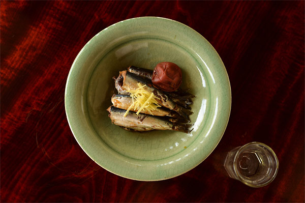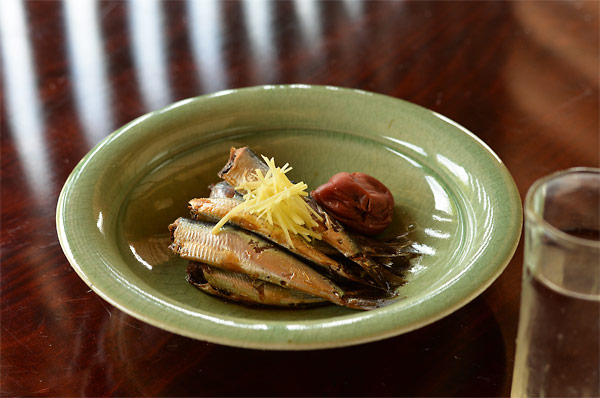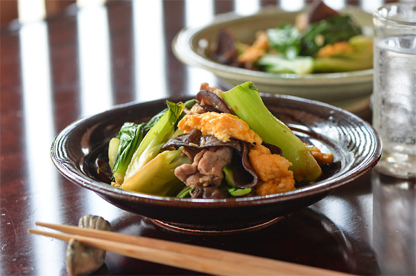 青梗菜と生きくらげの炒め物、いわしの梅煮。
