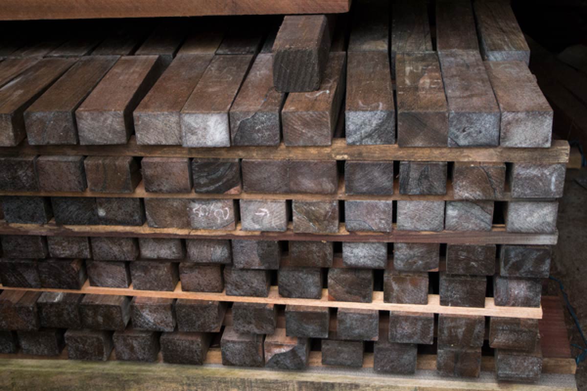 ▲今回の箸のもととなる、アフリカ黒檀の材木。木目が揃い、美しさがあります。「キリッとした感じがやっぱりいいなあ」と三浦さん。