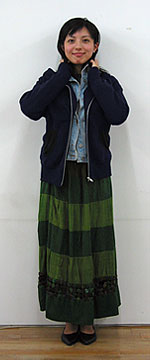 緑のアジアンロングスカート、黒パンプス