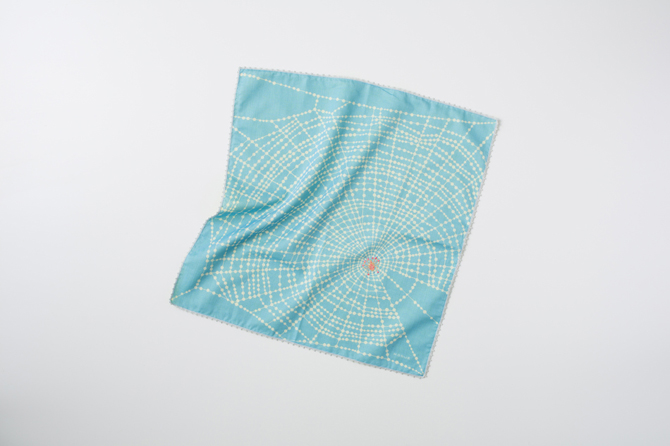 扇子とおそろいで使っていただける、 くもの巣柄のハンカチです。 表情がちがう2枚の薄い布をあわせているので、 気分によって両面を使いわけていただけます。 くもの部分は、細かい刺繍で縫われているんですよ。