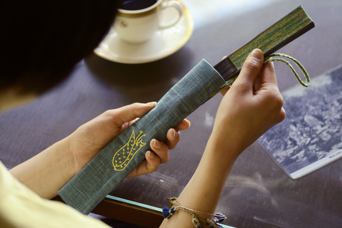 ●扇子の持ち手の方からやさしく出し入れしてください。