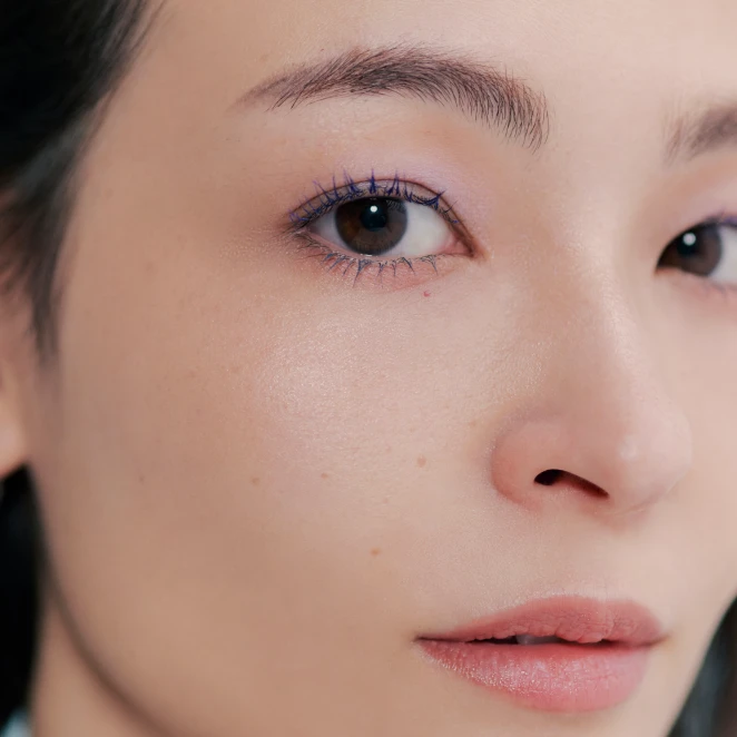 上のまつ毛をブルー、 下のまつ毛をグリーンブルーのマスカラで彩ったメイク。 上下とも同系色でありながら、 微妙なカラーの違いをたのしめます。 アイシャドウにはマスカラの色と相性のいい、 青みを含むパープル、ピンクの色を合わせました。