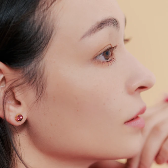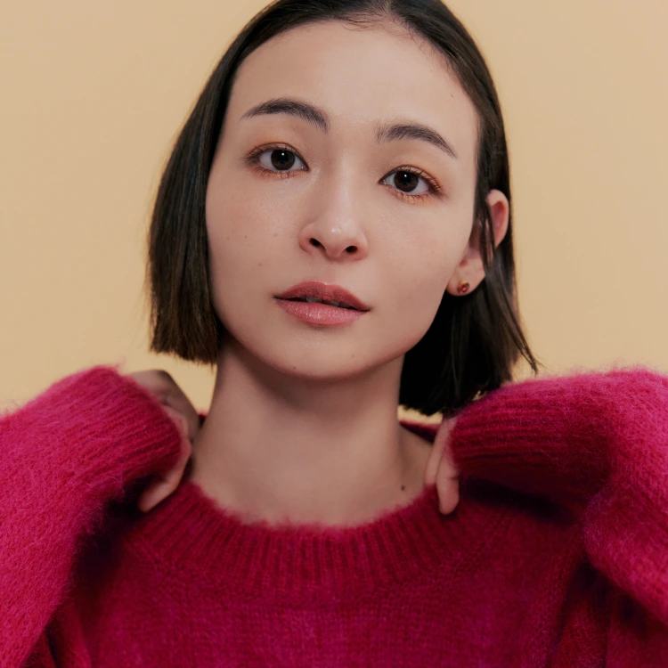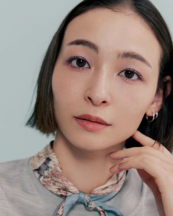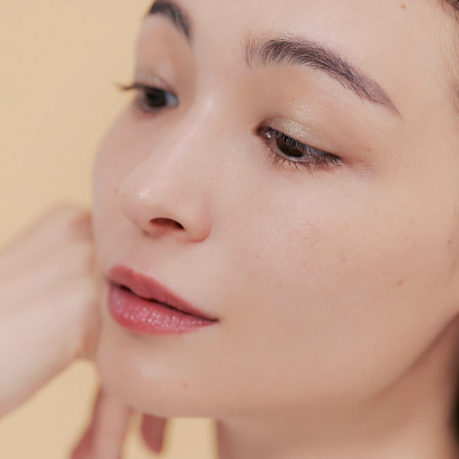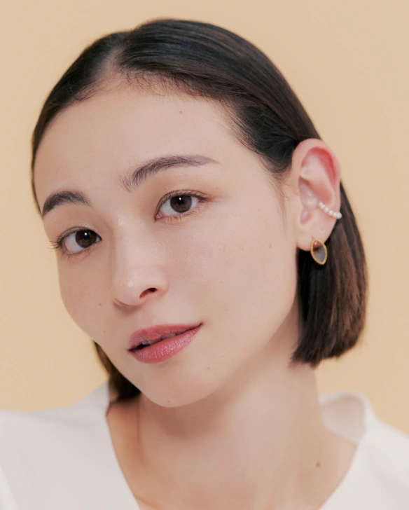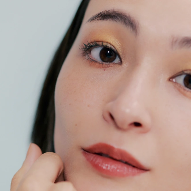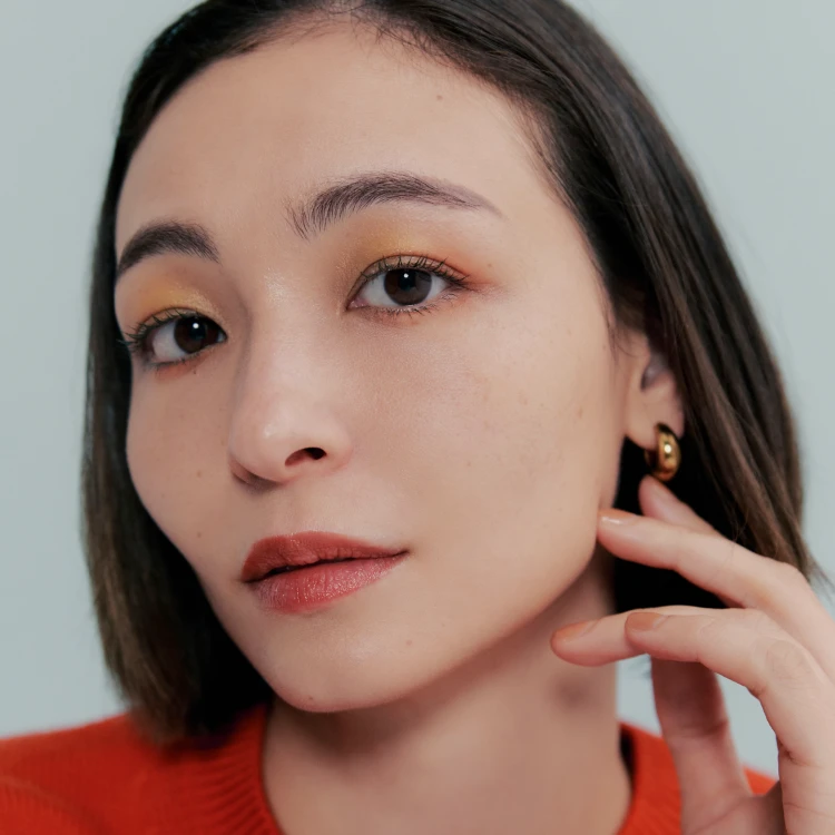 上のまつ毛には柿色(パーシモン)、 下まつ毛には鮮やかな赤のマスカラを使ったメイク。 アイシャドウには、肌なじみのいい ベージュ系のカラーをのせて、 目元全体をまろやかに仕上げました。 下まぶたの中央だけに入ったゴールドが さりげない光を放ちます。