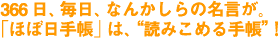 「ほぼ日手帳」のいろんな特長のなかでも、 もっともご支持をいただいているのが、 この、1日1ページの下の言葉なのかもしれません。 昨年までは、“ほぼ毎日”の掲載で、 ときおり、空欄の日があったりしましたが、 今年は、366日、毎日、 数々の名言や迷言が載っています! 文字通り“読みこめる手帳”になりました。 誰かと待ち合わせの時間に、本のように読んだり、 電車の中で、ひまつぶしに読んだり、 つらいときやサミシイときに、 ともだちに会うように読んだり、 それぞれの読み方をしてくださっているようです。 うれしいですねー。 手帳の下の言葉は、 セフティマッチ氏の言葉をはじめとして、 デリバリー版からは、“先輩ことば”、 “言いまつがい”“ナゾ療法”など。 そして、「ほぼ日」からは、 今日のダーリン、 ダーリンコラムからはじまって、 藤田元司さん、 小野田寛郎さん、 保坂和志さん、 岩井克人さん、 MAYA MAXXさん、 米原万里さん、 コートドールの斉須政雄さん、 ズーニー山田さん、 ゆーないとさん、 日々格言、 そして、「ガキバカ」、 「まるはが」もくわわって、 ときに笑い、ときにホロリとしたり。 日々、いろんな言葉に出会える手帳なんです!! そして、さらに、今年は、 「毎月、10日は、なぞなぞの日、 20日は、なぞなぞの答えの日」 として、なぞなぞを掲載しますよ! 「ほぼ日」ではすっかりおなじみの、 「なぞなぞといえば‥‥」の フジモトマサルさんが、 「ほぼ日手帳」用に、 書き下ろしてくださった新作ぞろいです! お友だちに、問題を出したりして楽しんでくださいね。 |