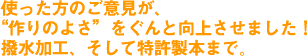 ナイロン素材は、多少乱暴に扱っても、 傷がつきにくく、気軽に持ち歩けるという 大きな特長があります。 昨年のナイロンカバーをお使いのみなさまからも、 「ナイロン素材自体は気に入っています」 と、素材そのものは、とても好評でした。 ですが、その一方で、 「シミがついて落ちない」 「素材が薄くて、手帳の表紙が透けるのが気になる」 などのちょっと痛いご指摘を受けもしました。 これらのご指摘を参考にして、 今年のナイロンカバーは、目立たないところに、 大きな改良をしました! まず、 「ほぼ日手帳2004」のナイロンカバーの表面に、 撥水加工を施しました! 雨の日に濡れちゃったとか、 水をこぼしちゃった! なんてときには、さっと拭いていただければ、 シミが残りません! また、 今回のカバーで使用しているナイロンは、 織りの密度が高く、 ナイロンの中でも、 高品質の素材を使用しています。 さらに! その素材を二重にすることで、 手帳本体のデザインが透けて見えることもなく、 しっかりとした、高級感すら感じられる、 ナイロンのカバーになりました。 2003年度版を、ご購入いただいていた方には、 今回のグレードアップを、 心から実感していただけると思います! |