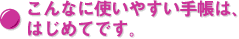 「ほぼ日手帳2002」「ほぼ日手帳2003」と、 これまで過去2年間、 「ほぼ日手帳」をお使いの方々から 「この手帳を使って、人生が変わりました!」 「毎日が、楽しくなりました!」 なんていう、とってもうれしいメールを、 ほんとうに、たくさん、いただきました。 実際に使っている人のナマの“声・声・声”を、 ぜひ、お聞きください。 手帳は何気に横からのぞいた友人に 「何これ! すごく使いやすそう!! どこで買ったの?」 といわれ、本気で得意になってしまいそうでした。 一目でわかる使いやすさが この手帳の何よりの強みだと思います。 もっと世間にPRするべきだと思います。 私はずっとこんな手帳を欲しかったけど、 「ほぼ日」を知らなかったので、 手に入れることはもちろん、存在すら知りませんでした。 絶対こんなすばらしい手帳を欲しい人は たくさんいるはずです。 実際、たくさんの友達に自慢したら、 うらやましがられましたもん。 打ち合わせ中など、幾度となく 「(書く欄が広くて)使いやすそうですね」と、 他の人からも褒められています。 いろいろな人が「その手帳いいね」って 言ってくれるので 自分のセンスを誉められているんじゃないかと うれしくなります。 2003年は、妹とお揃いで買いました。 その使いやすさを母に説明したところ 「ほしい」と言い出しました。 自称、文房具オタクです。 かなり使いやすいです。 1日1ページ使ってあの薄さはすごいと思います。 パソコンを1台持って歩くようなものと書いてあった 意味がよくわかります。 1日1ページなのにこの薄さ。 大きくもなく、小さくもないサイズ。 本当に最高の手帳だと思います。 こんなに使いやすい手帳は初めてなんです。 手帳本体の「糸掛り製本」は とても使いやすいですね。 パタンと開いておけるこの感覚は、 今までの手帳にはなかったものです。 その使いやすさ、便利さにびっくりです。 今では肌身離さず持ち歩いています。 今まで色んなスケジュールの情報が 自分自身でまとまっていなかったので、全てアバウト! 子供の学校行事や自分の予定、 おまけに家計簿代わりにその日買った物を記入したり、 口座引き落としになる金額を予め書き留めておいたりと、 家計簿三日坊主だった私には画期的な日々です。 これからもず〜っと必需品になると思うので 絶対に続けて作っていってください。 デザイナーをやっているのですが、 案件ごとの仕様とか何から色々と書き込んでます。 使い終わる頃には、手帳がそのまま 自前マニュアル(っていうか虎の巻)になるという。 だから、02年のもいつも仕事場のデスクの上に常備して、 ことあるごとに引っ張り出しています。 行きたい場所の地図・印象に残った雑誌記事・ 参考にしたいファッション写真などを沢山貼り付けて 自分の好きなもので埋め尽くしています。 1日1ページだからこそ出来る楽しみですね。 ダイエット日記に使っています。 時間軸になっているので、 何時に何を食べたか記入するのに便利です。 今年はダイエット頑張れるかな〜。 今まではず〜と家計簿を買っていたのですが、 ためしに一日の縦半分のスペースを 家計簿として使ってます。 とても、いい感じです。 重宝しているのは、検索性が高いことです。 正月から今日まで出費、献立、Activity、Excursion、 体調、飲んだコーヒーなどを気ままに書いていますが、 「年間予定表→月間カレンダー→その日のメモ」の 横断が自然に出来るところがすごいと感じています。 ほぼ毎日作るお弁当の記録として使っています。 「最近このメニュー食べてないな…また作ろう」とか、 「これはおいしかった!個人的ヒット!!」とか、 あとから見返すと日記並みに楽しいです。 オール手描きなのでたまに面倒にもなりますが、 続いているのは、1日1ページの書きやすさでしょう。 何度読んでも笑えるマンガ、とくに犬の方。 すーごい落ち込んでるときや疲れたときに見ると、 泣きながらでも笑えるんですよね。 元気だそうって、また泣けてくるときもありました。 今度のマンガも楽しみにしています。 毎日一言ずつ掲載されているのもとっても面白いです。 日々の楽しみになってます。 こんな言葉を残す●●さんってどんな人だろう? って興味をもってネットで検索してみたり、 引用されている本を購入してみたり。 自分を拡げてくれています。 毎日の今日の一言を支えにしてます。 ほんとに救われます。 「愛しているなら自由にしてあげなさい。」 目が覚めた一言でした‥‥。 遠距離恋愛で東京に住んでいる彼女も使ってます。 「日々の言葉」は、話題には出なくても、 お互い読んでいるんです。 これがイイんです。 毎日のページの一言が、すごく楽しいです。 最初に全部読んでしまうのだけれど、 その日が来るたびに読み返しても、新鮮です。 来年も、味わいのある言葉や、 ふきだしちゃうようなあったかい楽しい一言を お願いします。 カバー、これほんとにいい。 文庫本サイズ。 ‥‥