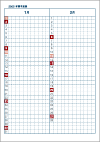 これまで年間カレンダー、年間予定表、月間カレンダーは、 1色づかいで、平日・休日・祝日、それぞれの区別は、 印刷色の濃淡で表現しておりました。 でも、これだと、ぱっと見た瞬間に、 平日・休日・祝日の差があまりわからない‥‥ ということがちょっとした弱点でもありました。 そこで‥‥! それぞれのカレンダーページを もっと快適にご活用いただくべく、 2005年版からは、 平日・休日・祝日の違いがひと目でわかるように、 休日と祝日は、「赤」系の色にしました! とくに、年間カレンダー、年間予定表は、 この2色使いにしたことによって、 想像以上に、見やすくなっておりますよ! 実際に、このことによって、 使い勝手もグンとアップすると思います。
