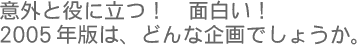 2005年の巻末のおまけのページは、 面白いんだけど、意外と役に立つページを とりそろえております。 すっかり恒例になりつつある、 「世界の○○」シリーズ。 2003年版の「世界のありがとう」、 2004年版の「世界の自己紹介」にひきつづき、 2005年版は‥‥ 「世界のI LOVE YOU」。 旅の途中、どこで何が起こるかわかりません。 突如、愛の言葉が必要になるやもしれません。 そんなときには、ぜひこのページをお役立てくださいませ! ![]() 「世界のI LOVE YOU」 先日、みなさまに投稿をおねがいしておりました、 「日本と世界の“姉妹辞典”」。 たくさんのご投稿を、ありがとうございました!! おかげさまで、日本全国の都道府県市町村の、 日本と世界を結ぶ姉妹都市がずらっと壮観できる、 ある意味、グローバルなページが完成しましたっ。 果たして、どんな姉妹都市が載っているのでしょうか‥‥ どうぞ、お楽しみに〜! ![]() 「日本と世界の“姉妹辞典”」 今回のおまけページのラインナップ、 “お役立ち系”のページも非常に充実しております。 和洋中華いろ〜んなメニューの「カロリー表」。 ![]() 「基本的なカロリー早見表」 よく、ファミレスなどにも、 各メニューのカロリーが載っていますよね。 あれって、 「パスタを食べたい気分なんだけど、 ミートソースとナポリタン、どっちかなあ?」 なんて迷ってるときなんかに、 けっこう“決め手”になるんですよね。 ダイエットしたいときにも、 とくにうれしいページになりそうですね。 その他にも、「世界のコンセントの形」とか、 「摂氏や華氏」なんて情報も載っておりますので、 海外に旅行や出張で行かれるときには、 ぜひお役立てくださいませ。 ![]() 「世界の旅支度」 そして‥‥ 「ほぼ日手帳」のおまけページといえば、 もちろん、あの、しりあがり寿画伯渾身の力作、 「何度読んでも笑える漫画」も、新作が登場します! 今年は、どんな漫画なのでしょうか‥‥ こちらも、手帳がお手元に届いてからの お楽しみにしてくださいね!! |