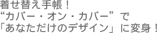 「明るい色の手帳は、とても魅力的なんだけど、 ビジネスの場面には、カジュアルすぎるかなあ‥‥」 というような場合は、 ふだん、お仕事でお使いのときに、 “カバー・オン・カバー”のなかに静かな感じの写真や 無地の落ち着いた色の紙をはさんでおけば大丈夫。 また、その逆に、オフィスにぴったりの色をお持ちなら、 休みの日には、飛び切り明るい写真や絵、 気に入った雑誌の切り抜きなどを入れて、 派手なTシャツのように 楽しんでお使いいただくのもいいですよね〜!! *“カバー・オン・カバー”をつけた状態では、 カバーの内側のカードポケットや大きなポケットは 通常どおり、お使いいただけますが、 カバーの外側のポケットは、ご使用できません。 あらかじめ、ご了承ください。 |
