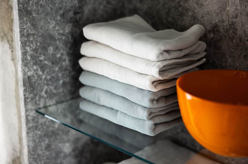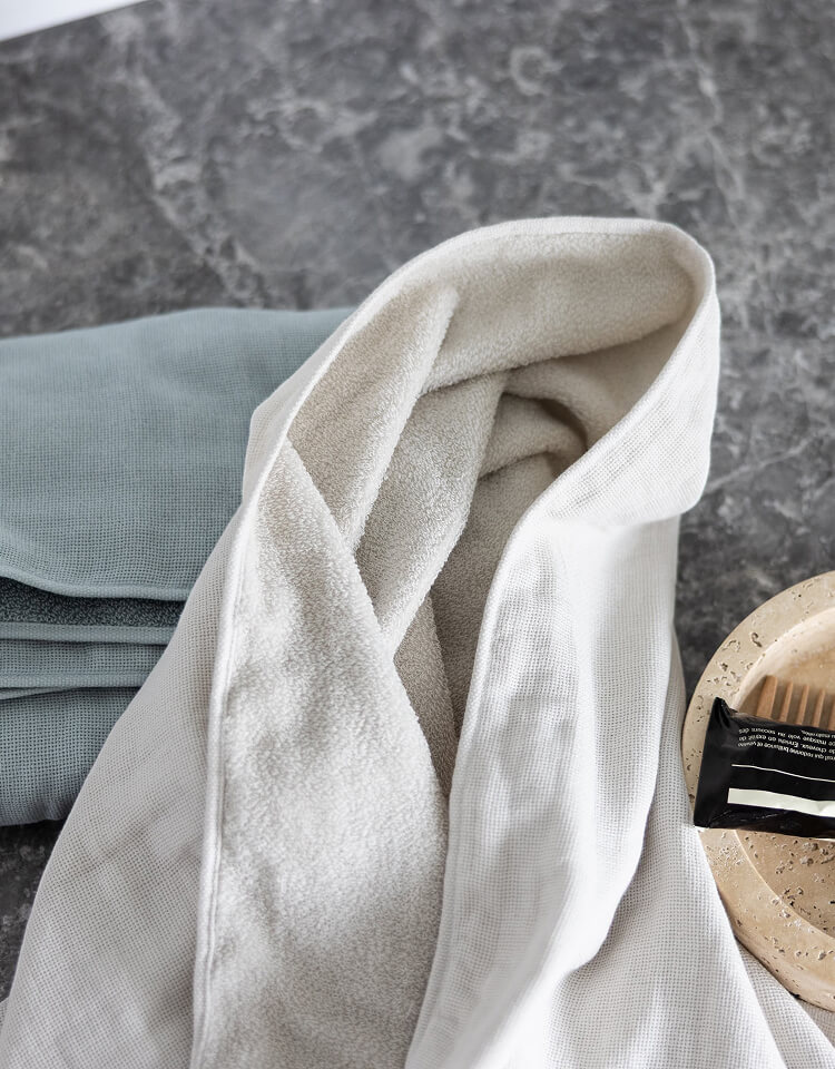 さらりとしたメッシュ状のガーゼを重ねた、2枚仕立てのタオルです。