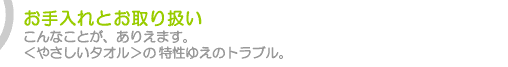 | <やさしいタオル>は、使っているコットンや、 片面ガーゼ、片面パイルという構造上、 おこりやすいトラブルがいくつかあります。 このページをよくお読みになって、 納得した上でお買い求めくださいね。