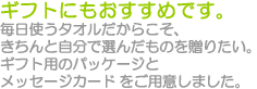 | 7月に販売したときに、 ご家族やご友人へのギフトにする、 という方からのメールをたくさんいただきました。 新しい生活を始める方へ、家族が増えた方へ、 そして、いつもお世話になっている方へ <やさしいタオル>のギフトはいかがですか? 今回の販売では、ギフトパッケージセットを 300円で販売いたします。 プレゼント用の発送もうけたまわります。