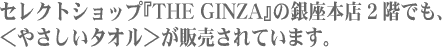 「現在 <やさしいタオル>を買っていかれるのは、 「ほぼ日」を知らずに手にとって、 良さを納得して、という方が多くなってきました。 お客様に、触っていただいて、見ていただいて 商品について説明させていただくと とっても納得していただけるんです。 そういう意味では、たくさんの情報を持った オススメしやすいタオルですよ。 」 2Fのディスプレイ。 ギフト包装もしてもらえるんですよ(無料)。 「販売開始当初は、 ほぼ日で見て <やさしいタオル>だけを買いに 来店くださる方がとても多かったんですが。 でも、そういう方は、 一度来店されて、次にいらっしゃるのに あまり間があかないようです。 おそらく試しに購入されて、 ご自宅で実際に使ってみて、 「よかった」って思って、 すぐにまたいらっしゃるんでしょうね。 リピート率の高い商品です。」 中槙さんはじめ、 THE GINZAの店員さんにも、 売っているあいだに<やさしいタオル>のファンになって ご自宅でも使ってくださっている方が、 とても多いんだそうです。