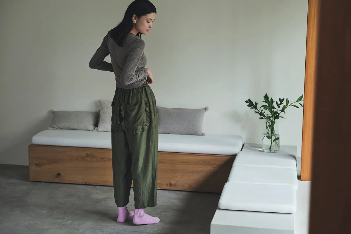 轟木 私は、はじめて購入したJOHAが靴下だったんです。 2017年くらいだったかな。 色や素材、当時読めなかったけど 「JOHA」という文字にも惹かれて。 次にインナーも買ってみたら着心地が好みで、 子供用からはじまったというストーリーも含めて 「好き」と思いました。 生地が杢調だったり、リブで陰影があったり、 表情がありますよね。 だから、チラッと見えたときも素敵で。