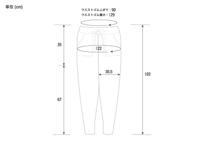 | 脇丈 | ウエストゴム上がり | ウエストゴム最大 | ヒップ | 股上 | 股下 | 渡り幅 | |