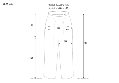 | 脇丈 | ウエストゴム上がり | ウエストゴム最大 | ヒップ | 股上 | 股下 | 渡り幅 | |