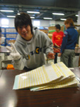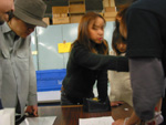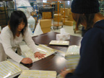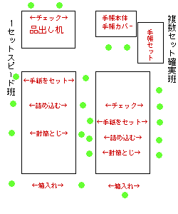 ほどなくして、 確実班も作業開始です。 【作業説明】 まずは西田店長が、 袋にいれる手帳の数、カバーの色などを 読み上げます。 これを品出し係がとってきます。 袋をうけとったなみこちゃんが、 数をかぞえて、 手帳とカバーをセットにします。 次に再度、あややが、 種類を読み上げながら、 アサノが確認しながら、 お手紙をおいていきます。 そして、それを、 袋詰めしていきます。 封をします。 で、ほぼ日見習いスタッフの、 「はせどん」が 箱につめる。 こちらは、佐川急便バーコード作業は、 佐川さんにお願いをしました。