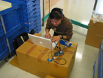 辰巳のアクロストランスポートさんの倉庫に 到着しました。 これより、様々準備をいたしまして、 本格的に開始いたします。 ええ、こんな段ボールの上から お送りしますね。 (そのあと、うーさんに机をつくってもらった。)