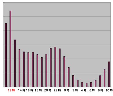 棒グラフは、「ほぼ日」の1時間毎のアクセスを