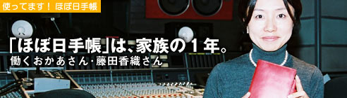 まず、最初にご紹介するのは、 ラジオ局にお勤めの藤田香織さん。 香織さんは、お勤めの一方で、 小学校1年生の息子さんを持つおかあさんでもあります。 お仕事は、毎日、とってもおいそがしく、 帰宅が深夜に‥‥なんて日もあるそうですが、 そんなときでも、 「子どもは、毎日すこしずつ成長していくので、 一瞬一瞬が、そのときしかない、 かけがえのない時間だと思って大切にしています」 と、息子さんの学校の行事にも、 できるかぎり参加しているそうですよ! 働く女性であり、妻であり、おかあさんでもある香織さん。 この3つの大切な役目を上手にやりくりしながら、 毎日、明るく、いきいきとすごしておられる 香織さんの「ほぼ日手帳」の中は、 いったいどんなふうになっているのでしょう?? この日は、香織さんのお仕事場である、 ラジオの収録スタジオにおじゃまして、 「ほぼ日手帳」を見せていただきましたっ!
