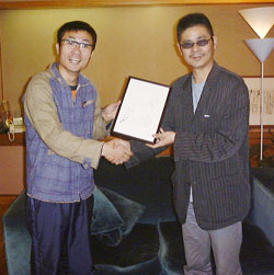 | 第16回(10月18日の暮らし) 日本のジャン・コクトー?来鼠! フレンチパーカ発売初日で忙しいながらも なんだか楽しい夕暮れ時に 日本のジャン・コクトーこと、 パンチユーホーさんが鼠穴に遊びにやってきました。 「パンチユーホーって誰よ?」 「東京牛パラダイスオーストリアのボーカルのさぁ」 とこれは伝わらない説明でした。(スマヌ) 『小判鮫ラジオ』のニセピカチュウとして 出演していたあのお方です。 結構、長いつきあいなんですけど 未だにぼく(ROCK西本)は この人をきちんと紹介できなかったりするんだよなぁ。 なんでも今日は 「渡したいものがある!」 のだとか。 「何よ、教えて?」 と訪ねると、 「鼠の絵を書いたから、糸井さんに渡してくれ!」 とのこと。 吉本興業の中でもカルト芸人というジャンルに カテゴライズされているパンチさんは 最近、勝手に日本のジャン・コクトー?と 名乗り、絵を書きはじめていたりするのです。 これまた最近、オープンしたホームページでは (http://www.punchufo.com/) その作品を披露してたりもします。 彼のホームページでその絵に出会ったdarlingは いたく彼の絵を気に入ってしまい、 思わず掲示板に書き込みをしてしまったのだとか。 これに気を良くしたパンチ画伯は 鼠穴ということで鼠の絵を書いて、 わざわざ額にまでいれて持って来てくれたのです。 (焼き芋の差し入れもいただきました!) (註:握手している写真) darling やっぱり名前にジャン・コクトーってあることは 影響受けたわけ? 画伯 いや、これがあんまり知らないんです・・・ darling えっ?そうなの。 (絵を見ながら)いいねぇ、 この後ろ足なんか足じゃないもん。 う〜んいいなぁ。 画伯 絵でほめられたのはこれが初めてですよ。 darling これはだれもマネできないよ。 マネ出来ないっていうのが大事。 コメント事体は褒めてんのか突っ込んでいるのか わからないが、かなり気に入っている御様子。 「よし、これは2階の会議室に飾ろう!」 ということでこれから鼠穴で会議をする度に もれなくパンチ画伯の作品が拝めることになりました。 鼠穴にこられたお客さんはどう反応するのか それはそれで楽しみだなぁ。 ジャン・コクトーの影響がどこにあるかどうかは わからないけど、とぼけた可愛さがあるよねえ。 これから何か書いてもらおうかなぁ。 ちょっと考えてみよう。 もしかすると、パンチ画伯の絵がほぼ日を飾ることが あるかもしれません。 (パンチ画伯の作品が見たい人はここをクリック) http://www.punchufo.com/ |