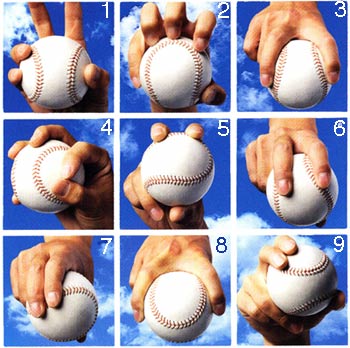 ボールの握りの答え: 1:パームボール 2:ナックルボール 3:スプリットフィンガーファストボール 4:チェンジアップ 5:ストレート 6:シュート 7:スライダー 8:フォークボール 9:カーブ 週末はこの握りを覚えてキャッチボールを始めよう! |