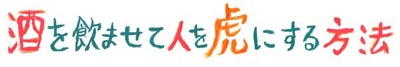 1.陽気になって大声で騒ぎはじめるタイプ→さわぎ酒 2.酒に飲まれて人事不省におちいるタイプ→のまれ酒 3.能弁になってうんちくを語りだすタイプ→ちしき酒 4.弱気になって泣いたり愚痴りだすタイプ→ぐちり酒 5.突然怒りだしたり説教したりするタイプ→からみ酒 6.前後の見境なく異性を口説きだすタイプ→くどき酒 それぞれのタイプの人間を酔払わせてみよう。 はたしてトラに変身するのだろうか? タイプ1 さわぎ酒 このタイプの人間はわかりやすい。 酔うと気持ちが大きくなって、あたりかまわず騒ぎだす。 阪神ファンならば、放っておいても虎になって、 「六甲おろし」を歌いはじめるだろう。 渥美清のまねがうまいんだって、とおだてれば、 勝手にフーテンの寅さんを気取る人間もいるだろう。 そこまでしなくとも酔うほどに声量もでかくなって、 しまいには意味不明のおたけびをあげる。 さわぎ酒タイプの人間は確かにトラに変身する。
