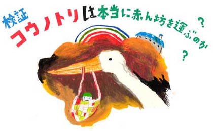 第6回 コウノトリが赤ん坊を運んでくるという話がある。 おおかたの人は嘘だと思っているだろう。 私もちょっと前までは嘘だと思っていた。 でも、考えてみて欲しい。 嘘にしては奇抜ではなかろうか。 突飛すぎると言ってもいい。 本当に赤ん坊を運んできた事例があって、 それに基づいて語られるようになったのかもしれない。 今回はその事例について考察してみたい。 コウノトリというと今ではめったにお目にかかれないが、 昔は人里近くで簡単に観ることのできる大型の鳥だった。 人家を気にせず、その付近で最も高い場所に巣を作る。 神社の境内の古木だったり、田んぼのあぜの松だったり。 「松に鶴」という構図の日本画があるが、 実際のところツルは木に止まることができない。 松との縁起物で瑞鳥のツルと間違えられたのだろうが、 モデルになったのはよく似たコウノトリだったに違いない。 屏風絵の画題になるくらいコウノトリは普通にいたのだ。 日本では珍鳥になってしまったコウノトリだが、 ヨーロッパでは現在でもよく人家付近で営巣している。 屋根の上や塔の上などがお気に入りの場所だ。 かの地では昔から人とコウノトリが仲良く生活してきた。 ツバメを思い出してみてもらえばいいが、 家を間貸ししていると、店子に愛着が湧くものである。 毎年春になると南から渡ってくる大きな鳥は、 西洋の人にとっては古来より幸福のシンボルだったわけで、 例の言い伝えが生まれる心理的な伏線は最初からあった。 では、その言い伝えの解剖をはじめよう。 まず、コウノトリはどこから赤子を運んできたのだろう? 当たり前の話、鳥類が人類の子どもを産むはずがない。 日本ならば河野や幸野など「こうの」姓は珍しくないし、 探せば「とり」とか「酉」という名の女性もいるだろう。 だから「こうのとり」さんが子を産むことも考えられる。 しかし舞台はヨーロッパである。 だとしたら考えられる答えはひとつ、 どこかから失敬してきたに決まっている。 どこから失敬してきたのか? 大胆な推理を働かせるなら、きっとキャベツ畑からだ。 赤ん坊はキャベツ畑で生まれるという伝説もあるのだから。 農民が畑仕事のかたわら赤子をあやしていたのだろうか。 いや、それだと赤ん坊はずいぶん大きかったはずだし、 農家の人だって見知らぬ鳥がさらう前に取り戻したはず。 大胆な推理その2、捨てられた未熟児だったのではないか。 小さくて軽かったからコウノトリでも運べたのだろう。 コウノトリはキャベツ畑に捨てられた未熟児を失敬した。 では、なぜ捨て子を拾ったのだろう? 鳥が他の生き物を捕まえる理由はひとつしか考えられない。 そう、餌にしようと思ったのだ。 コウノトリは普段カエルや魚、ザリガニなどを食べている。 生まれたてで無防備な赤ん坊は、 さぞかし食べ応えのあるごちそうに見えたことだろう。 コウノトリの親は大ナマズめいた赤子を自分の餌にはせず、 巣で待つヒナたちのために持ち帰ったはずである。 お腹を空かせた大食漢の3羽のヒナたちのために。 コウノトリの親は餌を丸呑みして運び、 ヒナたちの前で吐き戻して与える習性がある。 捨て子をさらったコウノトリもそうやって巣に戻った。 石造りの古い屋敷の屋根上にその巣は作られていた。 3羽のヒナのために赤ん坊を吐き戻そうとしたが、 いつもの餌より大きすぎて、コウノトリの親もあわてた。 首を左右に激しく振って、必死に吐き出そうとした。 コウノトリの喉からすぽんと抜け出た次の瞬間、 勢いがついた赤ん坊は煙突に入ってしまったのだ。 屋敷の住人は子どもに恵まれない若い夫婦だった。 初夏のある日、妻は使わなくなった暖炉の掃除をしていた。 そこへ天から小さな赤ん坊が降ってきたのだ。 神さまの贈り物にふたりは歓喜した。 屋根の上ではコウノトリの親が悔しさのあまり、 カタカタカタっとくちばしを打ち鳴らし続けたという。 若夫婦はそんなコウノトリに感謝して、 店子の巨鳥が赤ん坊を運んできたと近所で吹聴したらしい。 噂は巡り、伝わって……。 ![]()