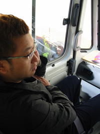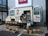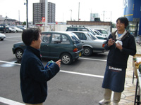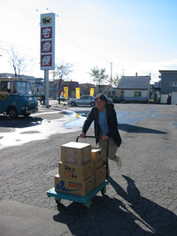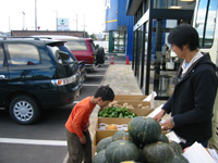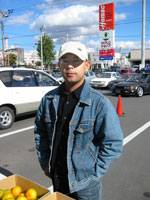 | おはようございます! 朝10時、旭川「豊岡タウンプラザ」のユニクロ駐車場にて SKIPトラックストア、本日もオープンしました〜! というわけで、野菜を売るイズミてんちょーのサポートは 一昨日に引き続きアッキィ画伯と、 昨日に引き続きROCK西本、 そして朝一番の飛行機でやってきた 徹夜明けのシェフ武井でございます。 頼りないこと。すまん。 こんな景色が広がってます。 富良野だって! 近いんだね〜! しかし寒い。朝、4度だって。東京の真冬の極寒なみ。 さいわい、昨晩から降り続いた雨は朝には上がって ちょこっと水たまりはあるものの、「晴れ」です。 でも時々曇ると、すごく寒い。太陽はありがたいっす。 SKIPの野菜やくだものも、太陽あってのおいしさだもんなあ。 実感。