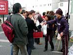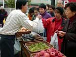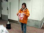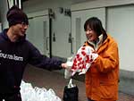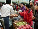 ROCK、スガノが列の最後尾で 限定100セットの、 「絶対得する500円セット」を 手渡します。 セットの中身は、 ・ほうれんそう1束 ・リンゴ(サンフジ)1個 ・みかん3個 ・じゃがいも3個 さすがイズミさんが気合いを入れた 内容だけあって、500セット、 大人気! |